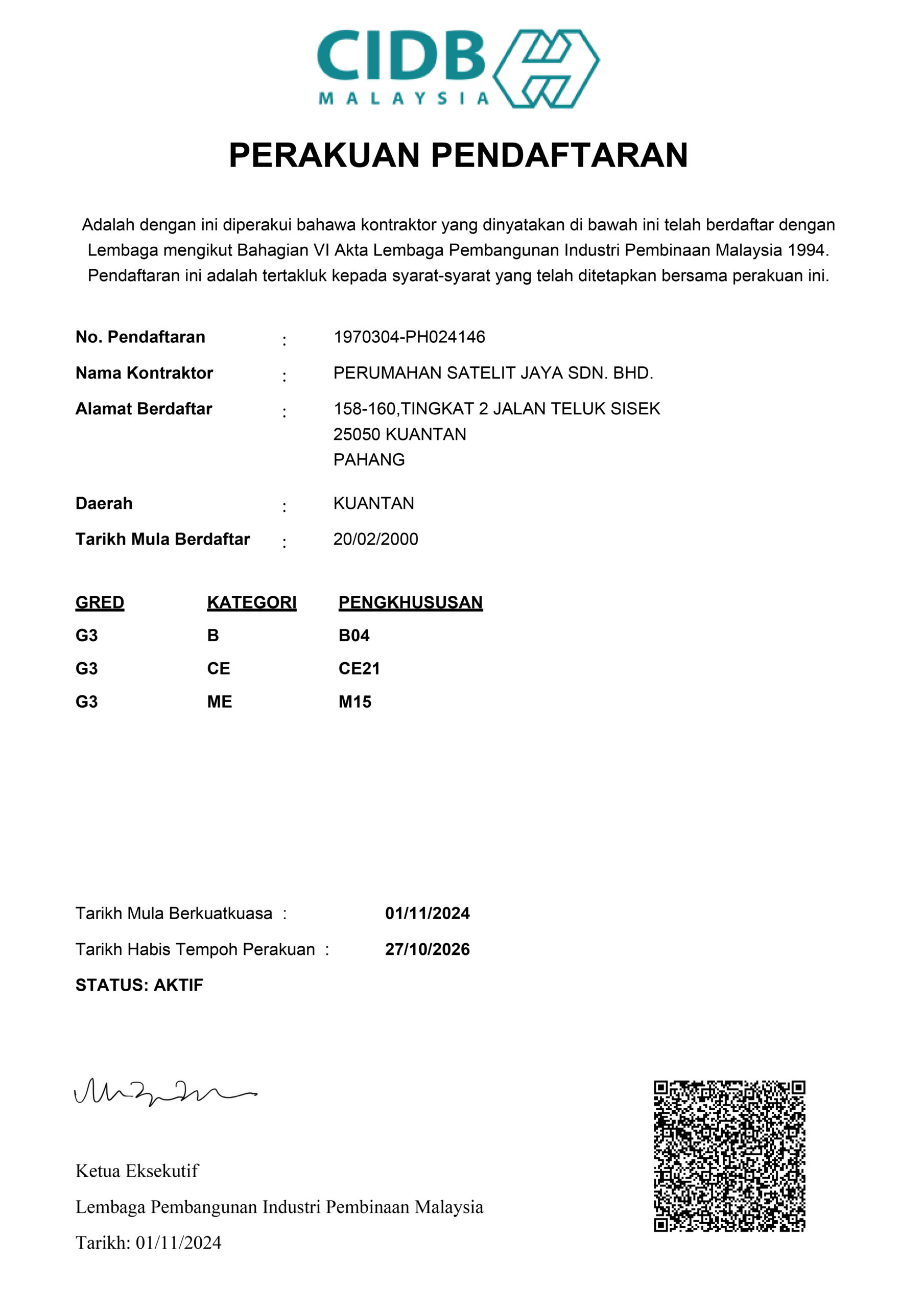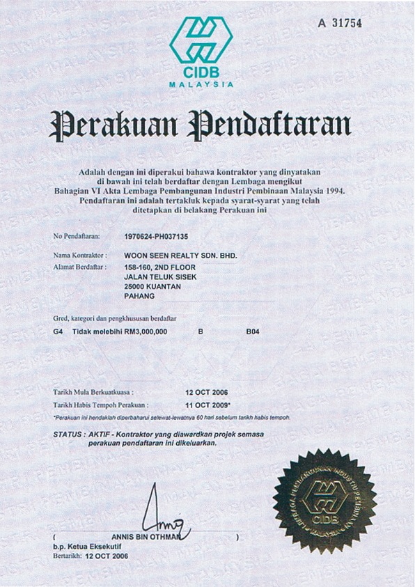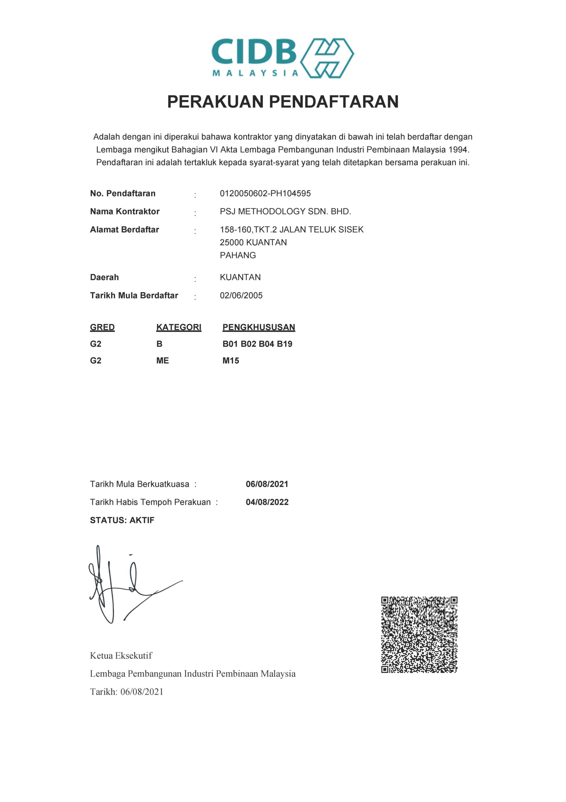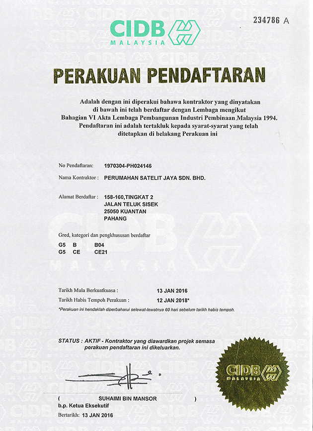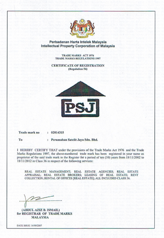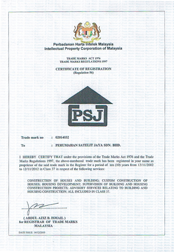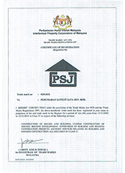 Certificate PSJ Methodology's Patent Registrations Malaysia' Patent Certificate Australia's Patent Certificate Philippines' Patent Certificate Indonesia's Patent Certificate Thailand's Patent Certificate CIDB Registrations Declaration of RegistrationWoon Seen Realty S/B1970624-PH037135 Declaration of RegistrationPerumahan Satelit Jaya S/B (PSJ)1970304-PH024146 (2016) Declaration of RegistrationPerumahan Satelit Jaya SB (PSJ)1970304-PH024146 (2024) Declaration of RegistrationPSJ Methodology S/B0120050602-PH104595 (2015) Declaration of RegistrationPSJ Methodology S/B0120050602-PH104595 (2021) Registered Trademarks Trademark RegistrationPerumahan Satelit Jaya S/BClass 36 Trademark RegistrationPerumahan Satelit Jaya S/BClass 37